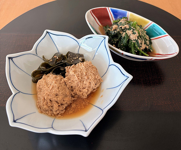 また、冬の寒さに当たり甘みがぐっと増したほうれん草を使い、タラの真子と昆布煮の煮汁を絡めた「ほうれん草の煮びたし」を作ります。