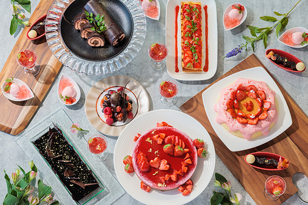 苺の季節の到来。ショートケーキ、パイ、クレープ、ティラミスなど苺をふんだんに使ったスイーツを食べ放題でお楽しみください。2月は苺とショコラの組み合わせも登場いたします。